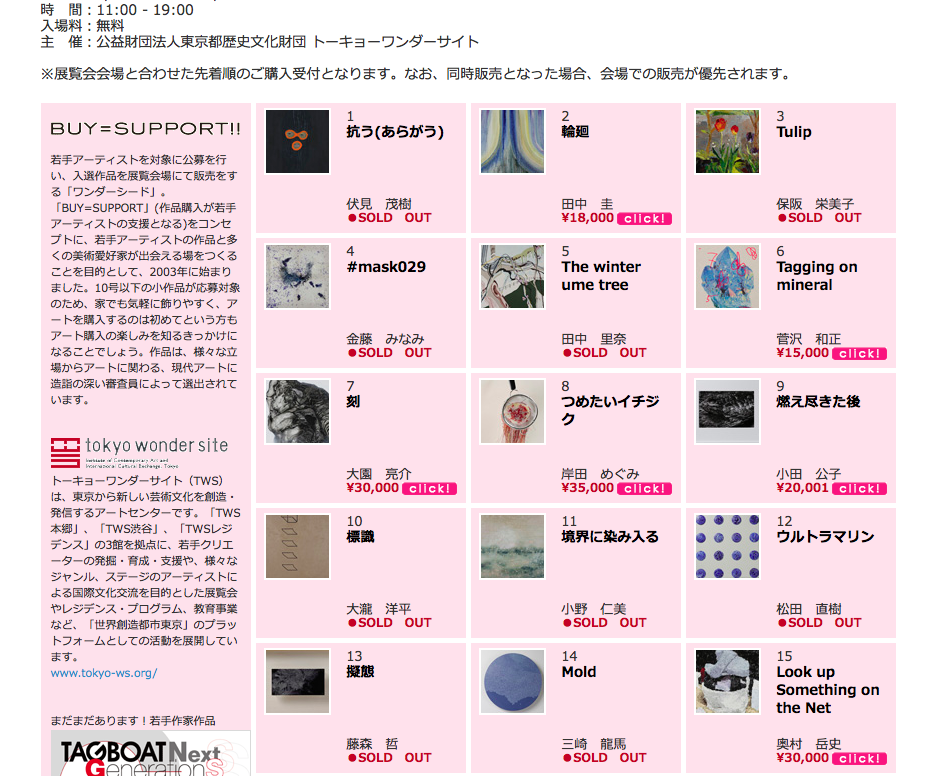 2月12日金曜日の夜10:00~、ワンダーシード2016はTAGBOATによるオンライン販売が始まっています。販売点数全84点、全ての作品が53×53cm以内、販売価格は3,000円〜40,000円までのサイズも価格もお手頃な展覧会です。実物を観てみたい、という方はトーキョーワンダーサイト渋谷で展示されていますのでぜひそちらに足をお運び下さい。
