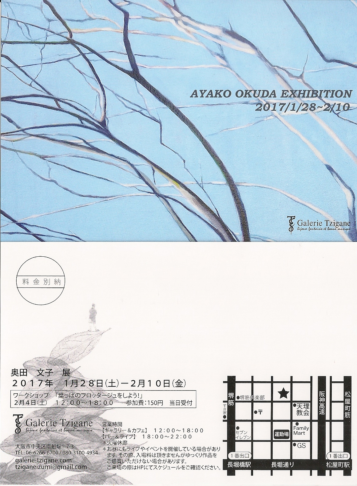 チガーヌの次回1月28日からはじまる展示は奥田文子さん、GALLERY MoMoの作家さんです。東京は両国にあるMoMoの作家さんの絵が大阪・船場で見れます。しかも2月4日はワークショップ「葉っぱのフロッタージュをしよう!」が開催されます。12時より随時受付、ぜひお越し下さい。フロッタージュってなに?という人のために説明を付け加えておくと、ちびっこの頃「こすりだし」と呼んでた、凹凸した所に紙を置いて上から色鉛筆やクーピーでこすり模様を写しとるあのやり方です。今回展示作品の中にもフロッタージュの作品があるそうですよ。
